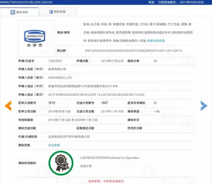 經(jīng)復(fù)審認(rèn)為,申請(qǐng)商標(biāo)顯著識(shí)別中文部分為“席夢(mèng)思”,與引證商標(biāo)一至四的中文部分“席夢(mèng)思”相比較,文字構(gòu)成完全相同,構(gòu)成近似標(biāo)識(shí)。申請(qǐng)商標(biāo)指定使用的畫框、竹木工藝品、家具用非金屬附件等商品與引證商標(biāo)一至四核定使用的鏡子(玻璃鏡)、竹木工藝品、家具用非金屬附件等商品屬于同一種或類似商品。若申請(qǐng)商標(biāo)與諸引證商標(biāo)共存于市場(chǎng),易造成相關(guān)消費(fèi)者對(duì)商品的來(lái)源產(chǎn)生混淆或誤認(rèn),已分別構(gòu)成《中華人民共和國(guó)商標(biāo)法》第三十條所指的使用在同一種或類似商品上的近似商標(biāo)。申請(qǐng)商標(biāo)指定使用的家具、床、床墊、床架(木制)、軟墊商品與引證商標(biāo)一至四核定使用的商品,不屬于同一種或類似商品,故申請(qǐng)商標(biāo)與諸引證商標(biāo)在上述非類似商品上未構(gòu)成《商標(biāo)法》第三十條所指之近似商標(biāo)。