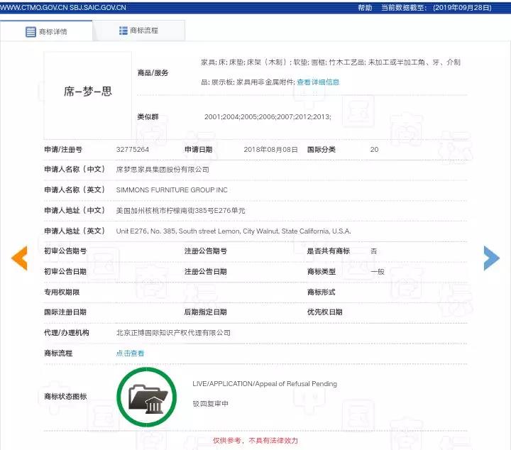申請(qǐng)人:席夢(mèng)思家具集團(tuán)股份有限公司委托代理人:北京正博國(guó)際知識(shí)產(chǎn)權(quán)代理有限公司 申請(qǐng)人對(duì)我局駁回其第32775264號(hào)“席一夢(mèng)一思”商標(biāo)(以下稱申請(qǐng)商標(biāo))注冊(cè)申請(qǐng)不服,向我局申請(qǐng)復(fù)審。我局予以受理,現(xiàn)已審理終結(jié)。