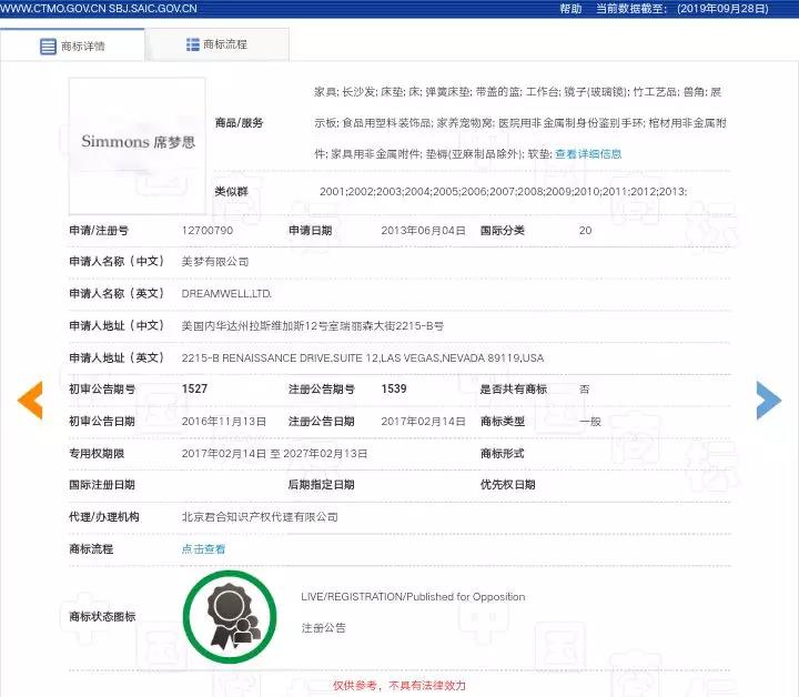 申請(qǐng)人復(fù)審的主要理由:申請(qǐng)商標(biāo)經(jīng)申請(qǐng)人長(zhǎng)期的使用和宣傳具有一定的知名度。申請(qǐng)商標(biāo)與駁回決定中引證的第12700789號(hào)“席夢(mèng)思SIMMON-S”商標(biāo)、第12700790號(hào)“席夢(mèng)思SIMMONS”商標(biāo)、第12700791號(hào)“席夢(mèng)思”商標(biāo)、第12953093號(hào)“SIMMONS席夢(mèng)思”商標(biāo)(以下稱引證商標(biāo)一至四)未構(gòu)成使用在同一種或類似商品上的近似商標(biāo)。“席夢(mèng)思”具有商標(biāo)的顯著特征,不是床墊產(chǎn)品的通用名稱。且申請(qǐng)商標(biāo)由英文“simm-ons”及對(duì)應(yīng)中文“席夢(mèng)思”組成,整體具有較強(qiáng)顯著性,未違反《商標(biāo)法》第十一條第一款第(一)項(xiàng)的規(guī)定。請(qǐng)求準(zhǔn)予申請(qǐng)商標(biāo)的初步審定。