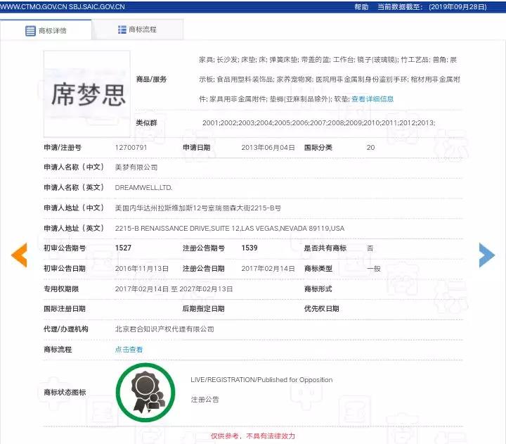 關(guān)于第32775264號(hào)“席一夢(mèng)一思”商標(biāo)