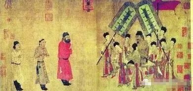 唐閻立本所繪《步輦圖》中唐太宗左右侍者撐雉尾扇