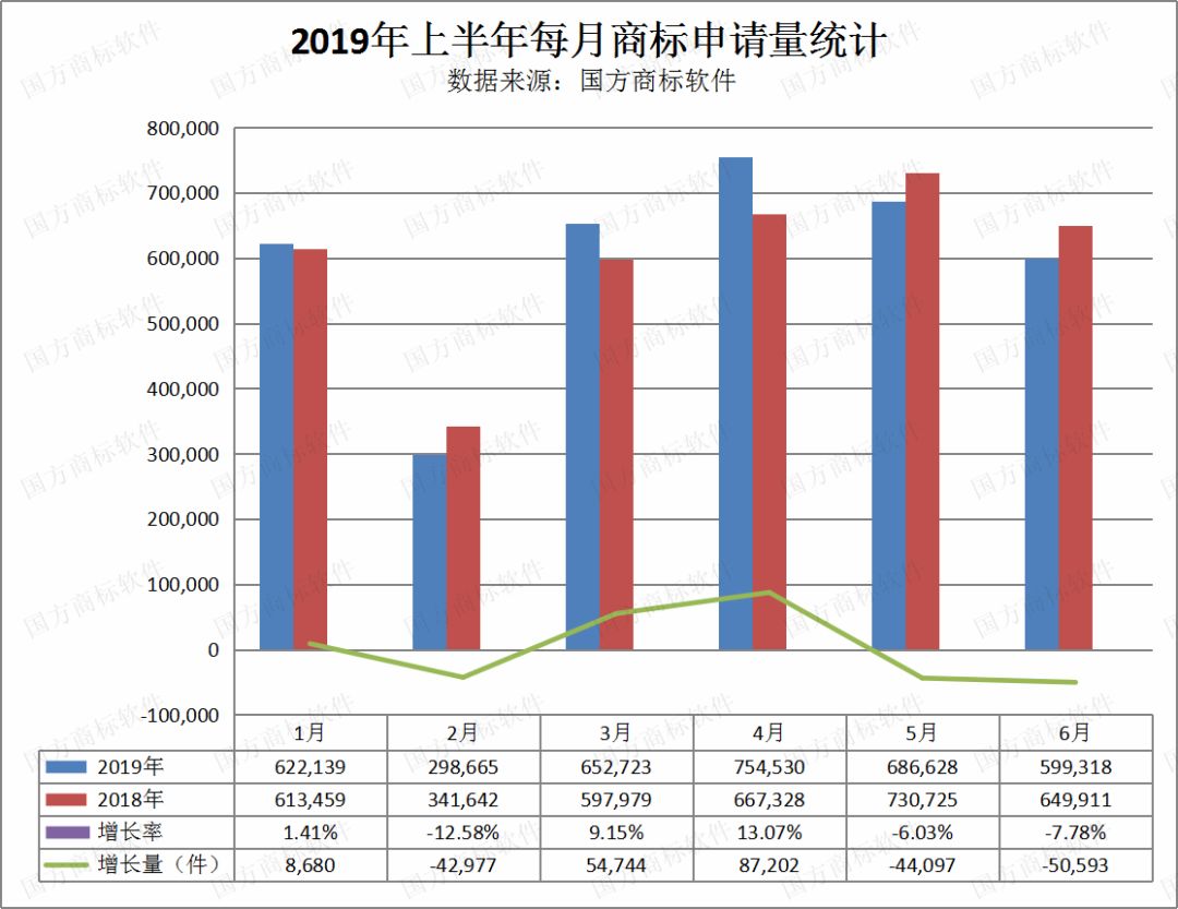 近日,國(guó)方商標(biāo)軟件發(fā)布“2019年上半年每月商標(biāo)申請(qǐng)量統(tǒng)計(jì)表”。數(shù)據(jù)顯示,2019年上半年我國(guó)商標(biāo)申請(qǐng)量為3614003件,較2018年同期增長(zhǎng)0.36%。
