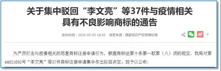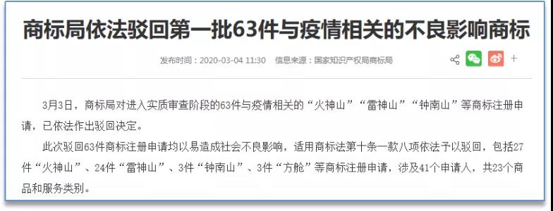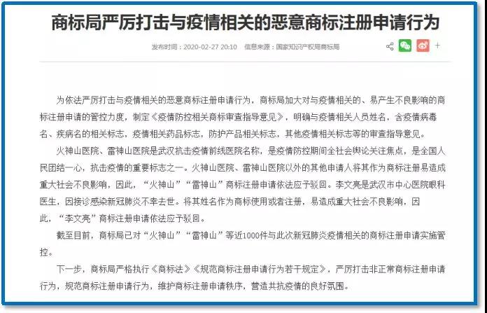 2月27日,商標(biāo)局明確將依法駁回李文亮商標(biāo)注冊(cè)申請(qǐng),并首次公布對(duì)火神山、雷神山等1000余件與疫情相關(guān)的商標(biāo)注冊(cè)申請(qǐng)實(shí)施管控。