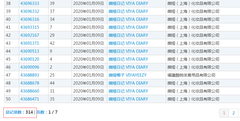 咱們再來看看薇婭的。根據(jù)商標(biāo)網(wǎng)商標(biāo)信息顯示,有關(guān)“薇婭”商標(biāo)314件,“VIYA”商標(biāo)135件。