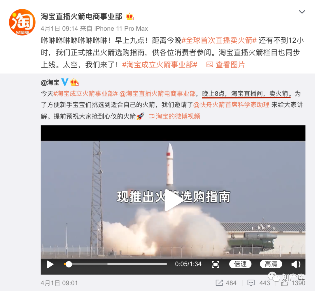 阿里巴巴官微發(fā)布消息“淘寶宣布成立火箭事業(yè)部,今晚8點(diǎn),淘寶直播間將直播賣出全宇宙第一單火箭,聽說還有滿4500萬減499萬優(yōu)惠券。”