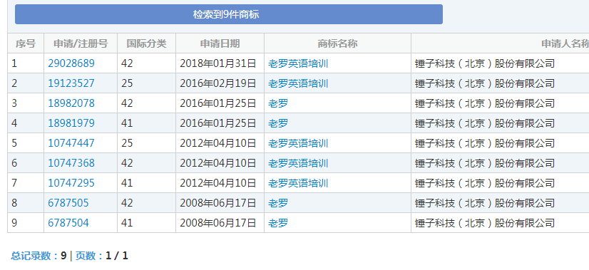 其中,跟羅永浩有關(guān)系的也只有“錘子科技(北京)股份有限公司”申請的9件商標(biāo)而已。