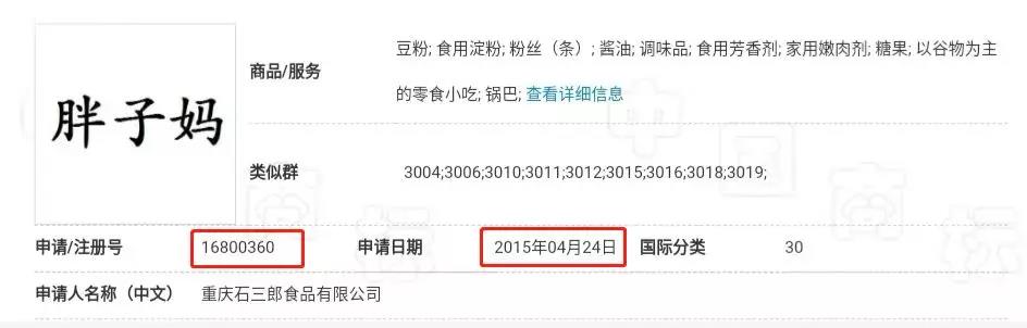 通過商標官網(wǎng)查詢,“胖子媽”商標比“胖子”商標申請晚了整整20年,直到2015年才申請注冊。