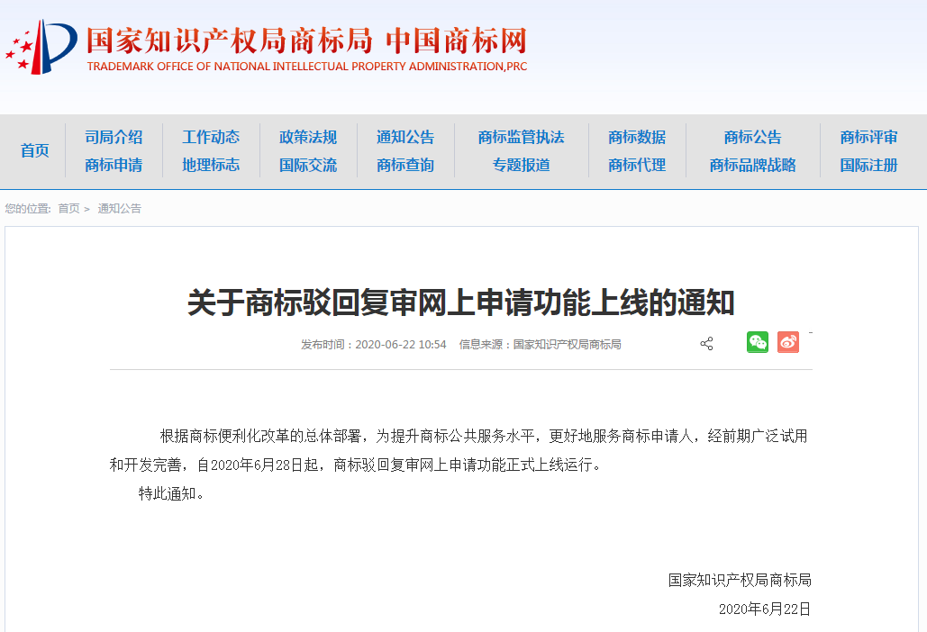 關(guān)于商標(biāo)駁回復(fù)審網(wǎng)上申請功能上線的通知