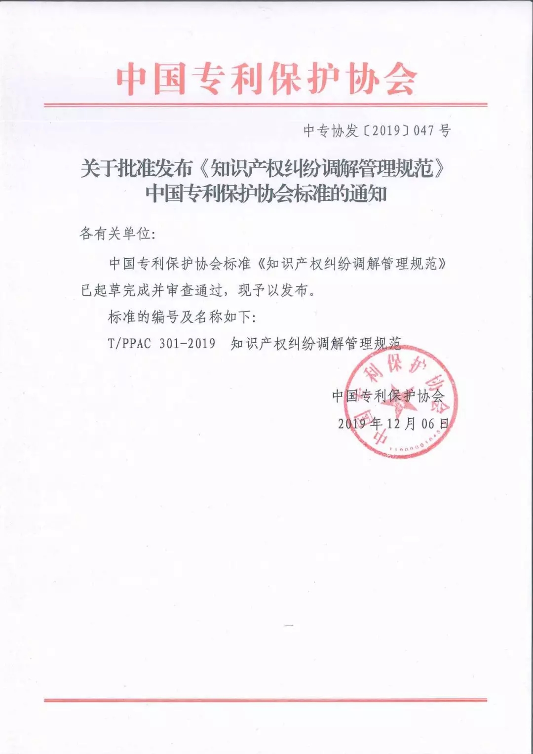 關(guān)于批準(zhǔn)發(fā)布《知識(shí)產(chǎn)權(quán)糾紛調(diào)解管理規(guī)范》中國專利保護(hù)協(xié)會(huì)標(biāo)準(zhǔn)的通知