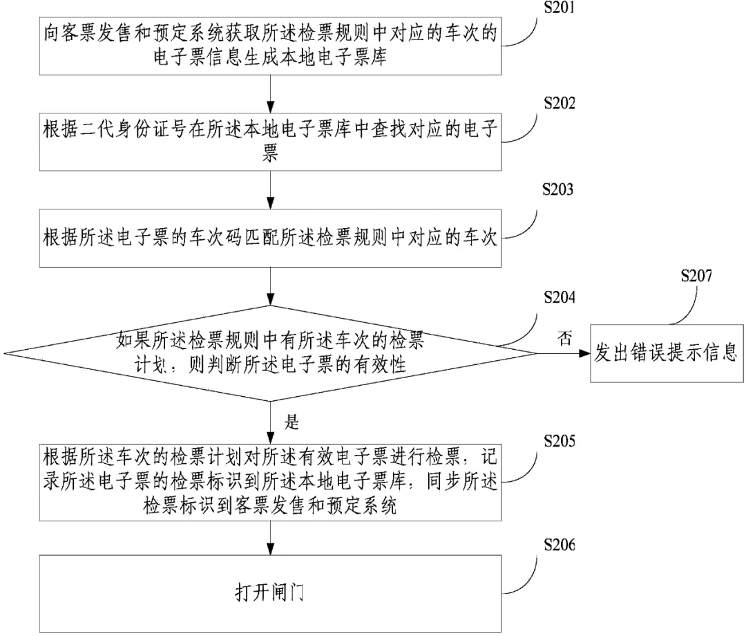 本發(fā)明涉及一種鐵路自動檢票方法及系統(tǒng),包括:獲取客票基礎數(shù)據(jù)和列車實時到發(fā)信息;根據(jù)所述客票基礎數(shù)據(jù)和列車實時到發(fā)信息生成列車檢票計劃;以列車的車次為索引將所述列車檢票計劃生成檢票規(guī)則;根據(jù)所述檢票規(guī)則完成自動檢票。本發(fā)明通過從客票發(fā)售和預訂系統(tǒng)獲取客票基礎數(shù)據(jù),從旅服平臺獲取列車實時到發(fā)信息,據(jù)此生成檢票計劃,并以列車的車次為索引將所述列車檢票計劃生成檢票規(guī)則,進行磁票、電子票和中鐵銀通卡的有效性檢查處理,允許持合法票的旅客通過,對持非法票的旅客進行相應錯誤提示,完成旅客進出站自助檢票,為廣大旅客出行提供了便捷的檢票方式,增強了高鐵鐵路乘客的檢票體驗,為鐵路穩(wěn)定安全發(fā)展做了充分的技術保障。