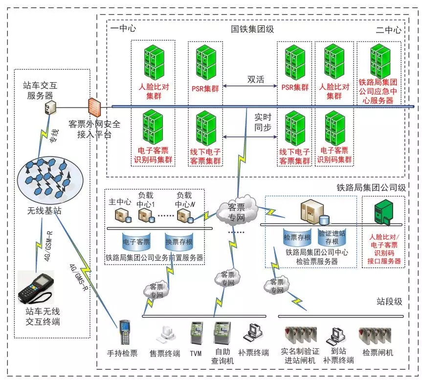 本發(fā)明提供一種鐵路電子客票系統(tǒng),包括電子客票預訂及變更子系統(tǒng),其中訂票模塊用于接收用戶通過中介輸入的訂票信息和個人身份信息,生成對應的電子客票,并返回與電子客票對應的認證信息,并將電子客票信息保存到電子客票處理服務器,電子客票處理服務器用于更新電子客票信息的狀態(tài),并按照指定時間將電子客票信息發(fā)送給車站檢票子系統(tǒng)和車上驗票子系統(tǒng);車站檢票子系統(tǒng)和車上驗票子系統(tǒng)獲取用戶的電子介質憑證信息,根據(jù)電子客票信息對用戶進行合法性驗證。通過本發(fā)明提供的鐵路電子客票系統(tǒng),實現(xiàn)了以電子客票作為一種運輸和結算手段,為鐵路客運部門和旅客帶來更多利益,使旅客有了更多的選擇和便利。