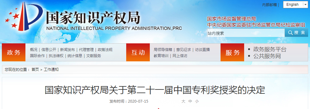 7月15日,國家知識產(chǎn)權局發(fā)布了第二十一屆中國專利獎授獎決定,30項發(fā)明、實用新型專利榮獲中國專利金獎,10項外觀設計專利榮獲中國外觀設計金獎。